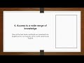 Selain itu, sebagian besar konten yang diproduksi di internet adalah dalam bahasa Inggris, banyak film, buku, dan musik top dunia juga diterbitkan dan diproduksi dalam bahasa Inggris.